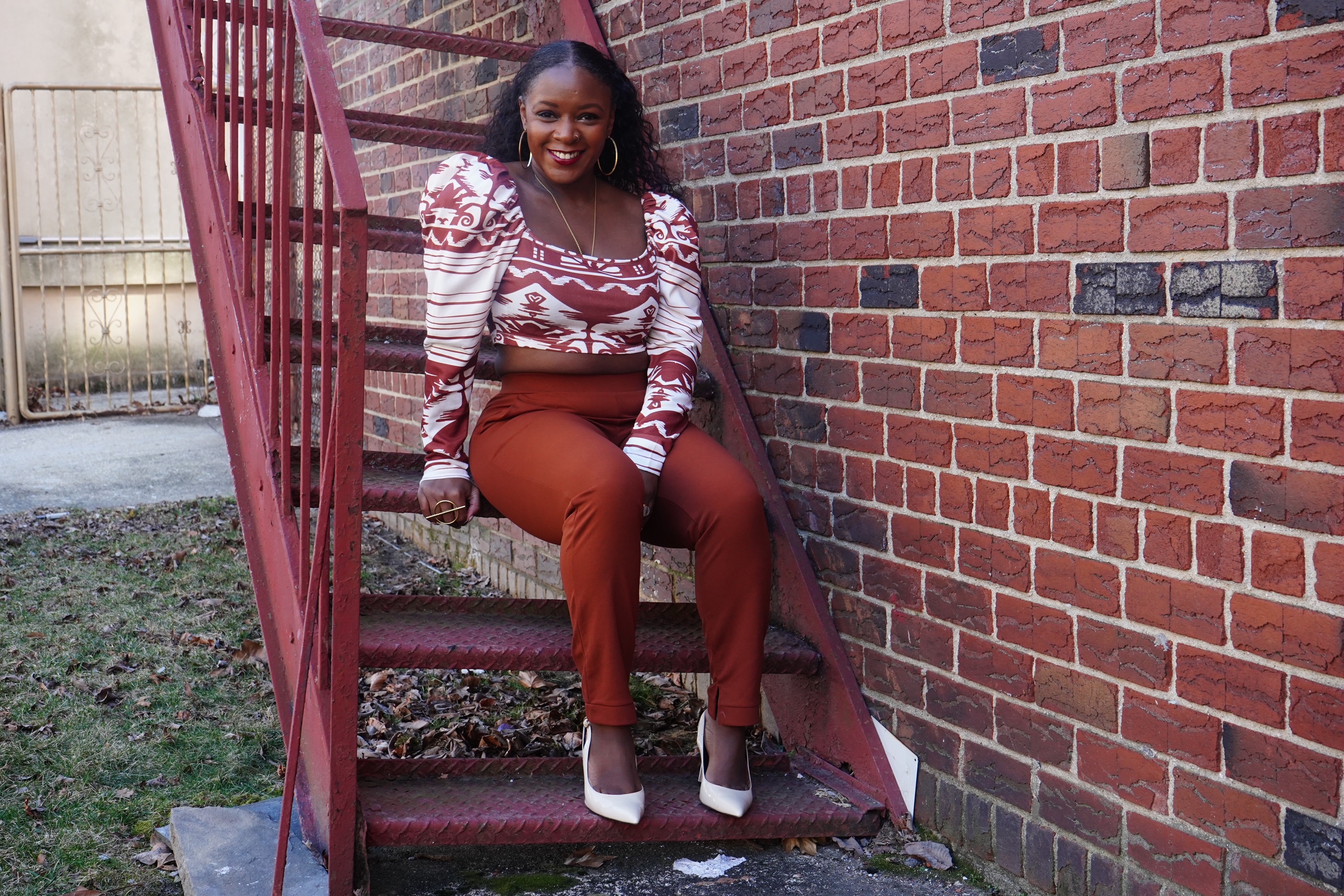 The Graphic Print Square Neck Gigot Sleeve Top caught my eye because of the fun print. This cropped blouse came with a matching skirt, but I decided to execute the look with solid colored pants. I was worried I wouldn’t find the exact hue, but Shein literally has one of everything. A few weeks after I purchased the top, I found a pair of slacks that matched perfectly.